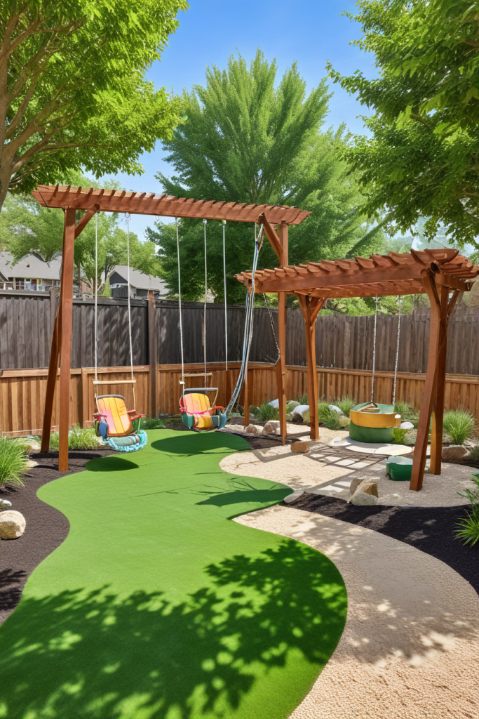 Family-friendly yards balance functionality with fun for all ages. Include open grassy areas for play, a patio or deck for relaxation, and features like a swing set or sandbox for kids. Add a fire pit for family gatherings and create shaded spots with umbrellas or pergolas. Use durable, low-maintenance materials to withstand wear and tear.