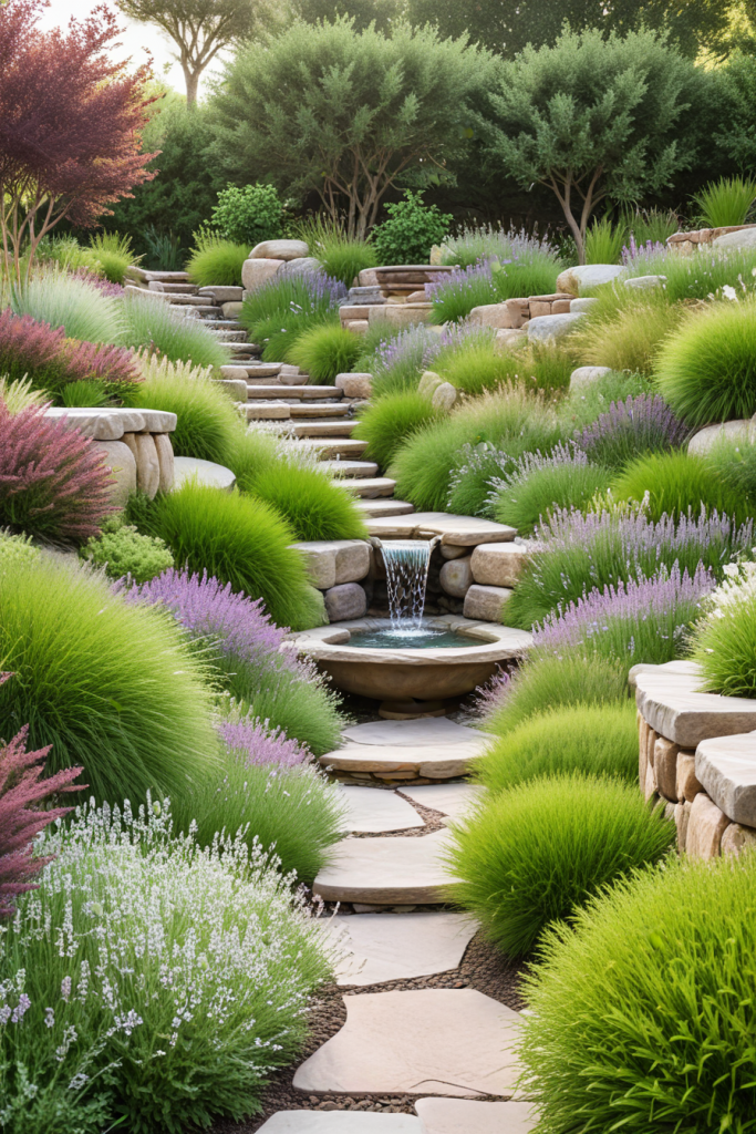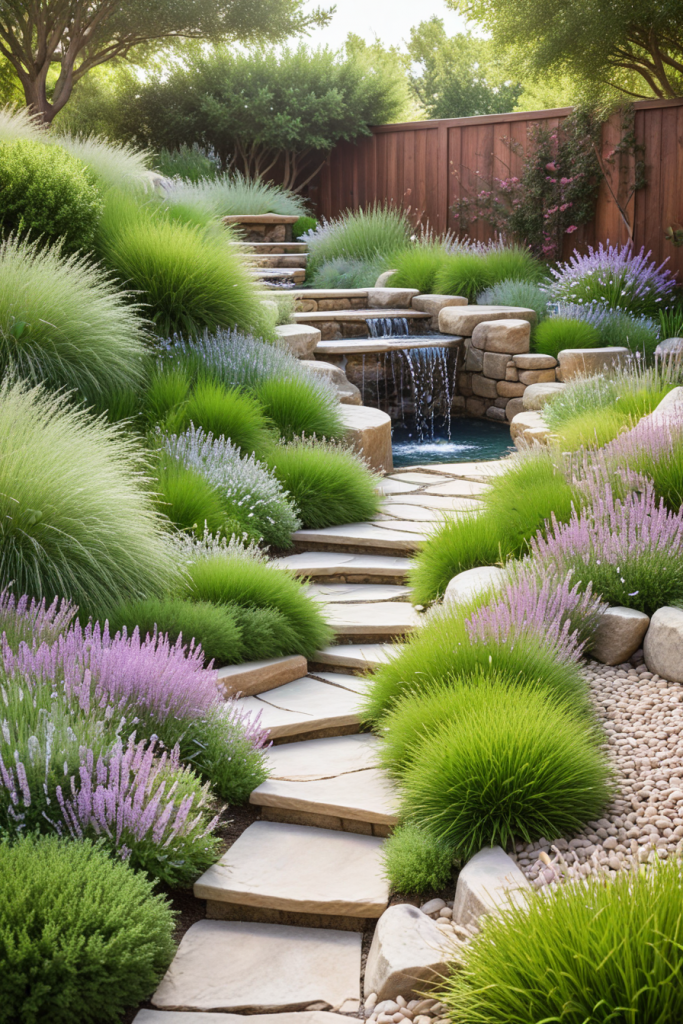 Sloped yards offer unique opportunities for creative landscaping. Terracing is a popular solution, using retaining walls to create flat planting levels. Add stairs or winding pathways for accessibility. Plant ground covers like creeping thyme to prevent erosion, and use ornamental grasses or shrubs for a layered effect. Incorporate water features, like cascading fountains, to enhance the natural slope.