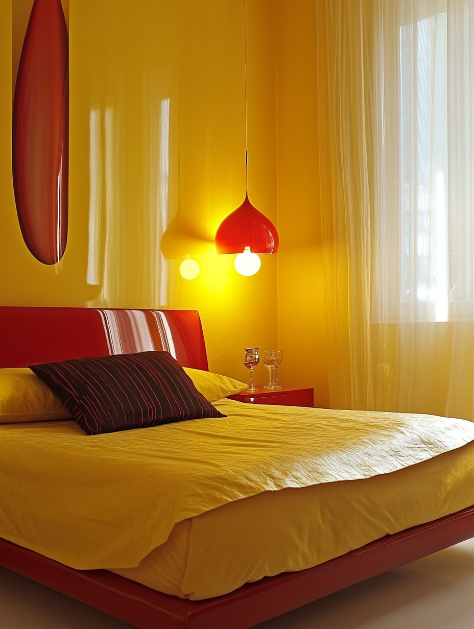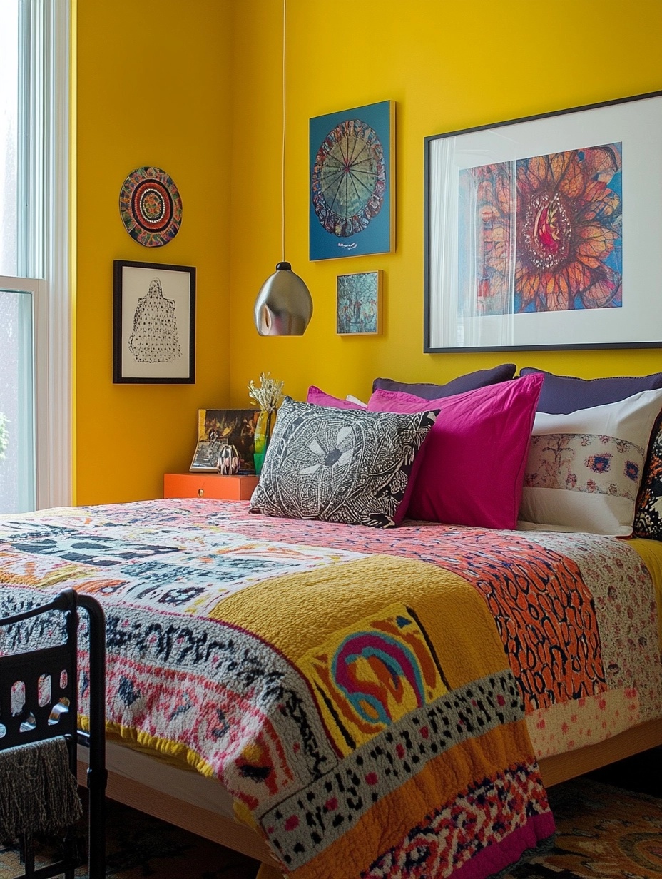 Get a glimpse of the colorful and cheery pop art style with a yellow bedroom. Yellow walls paired with various graphic art prints and a cacophony of color in the furniture create a lively and dynamic space. This fun and quirky look is for those who are into creativity and want to express themselves through their decor.
