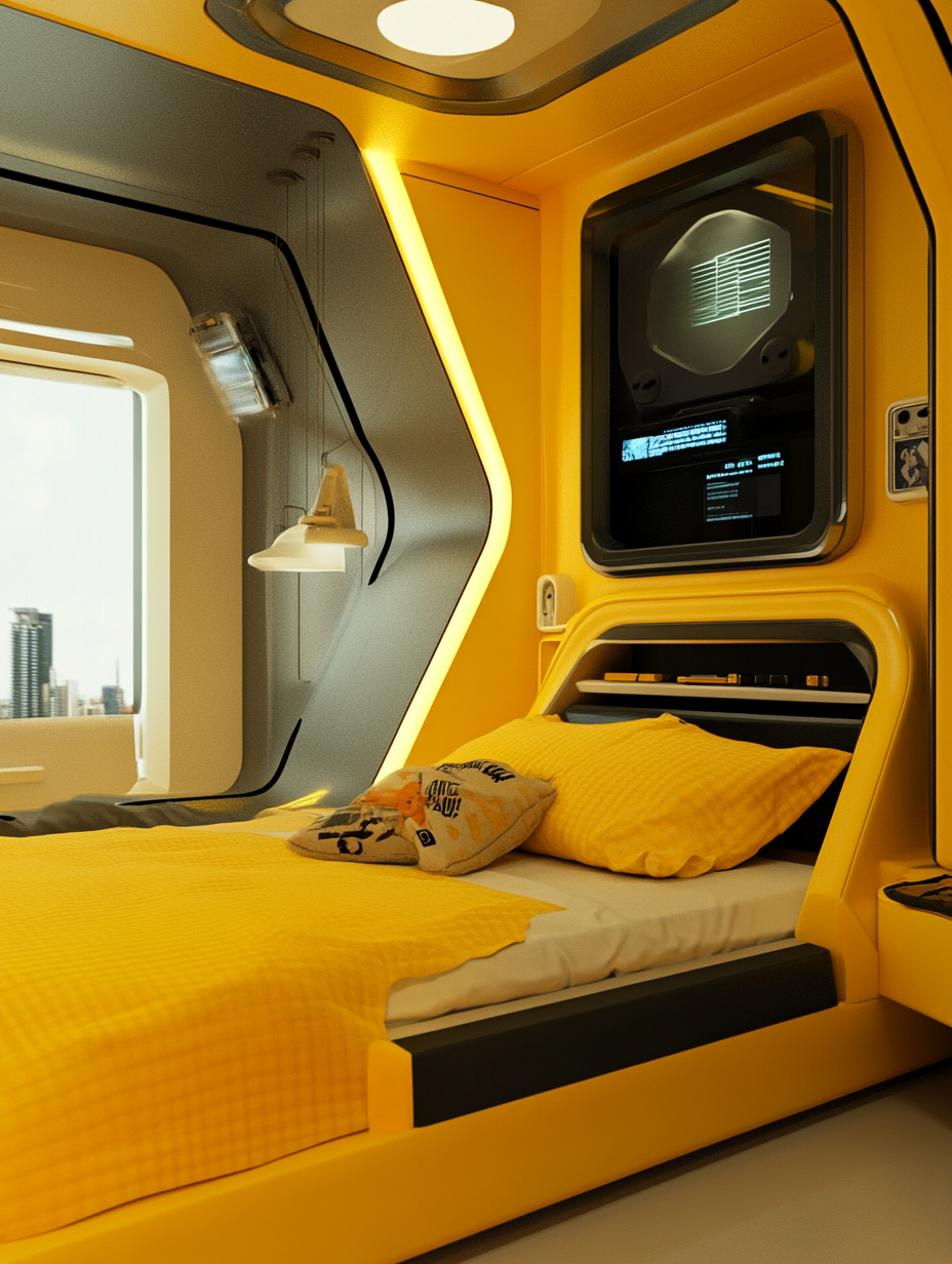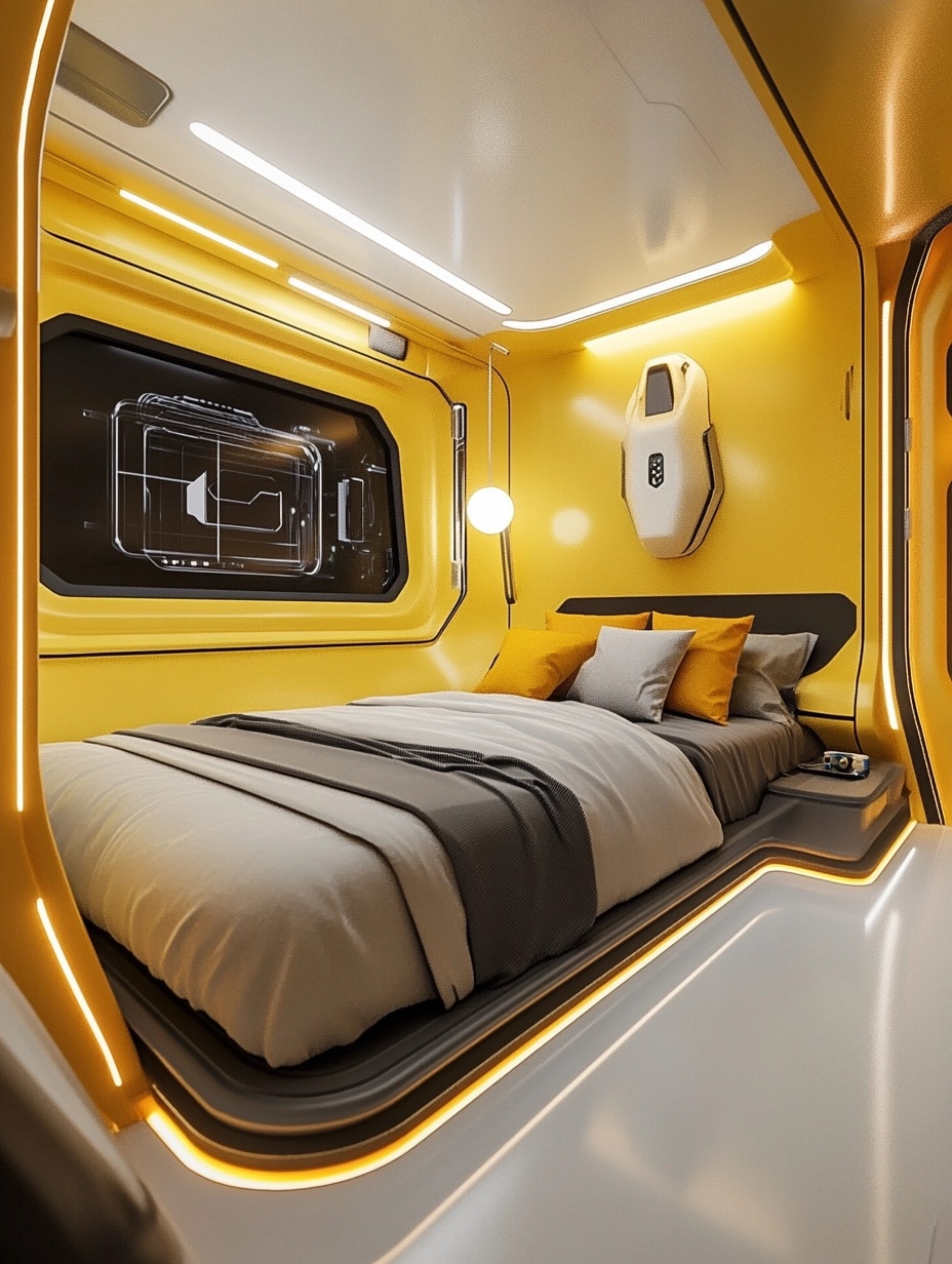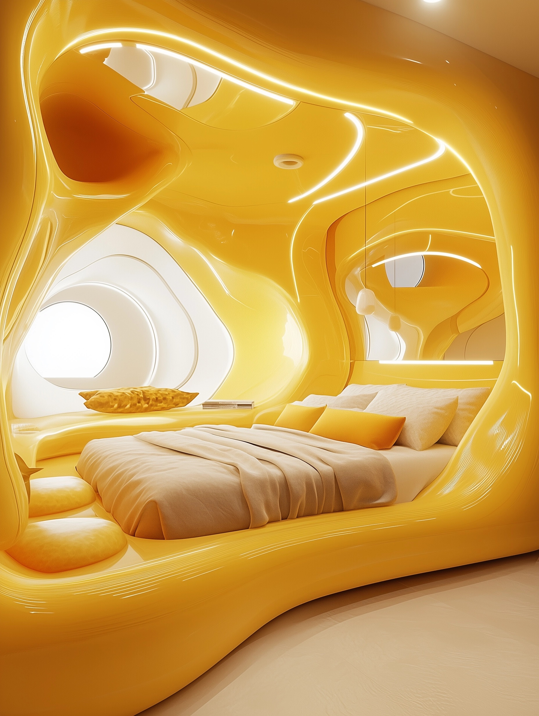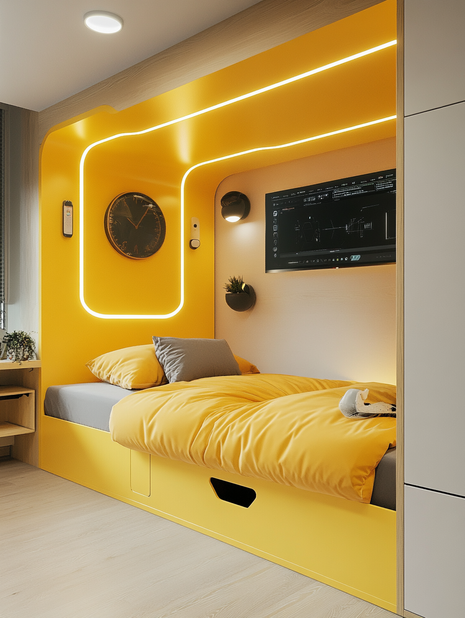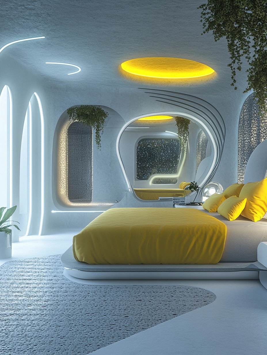 A techno-style yellow bedroom is like a kind of science fiction with a crowd of people breathing in its bright atmosphere. Complementing neon yellow with metallic accents and the most modern furniture makes the room not only an entertaining space but also an emotional project. The use of “Smart Lighting” and futuristic decors will not be limited to the future feel of your room.
