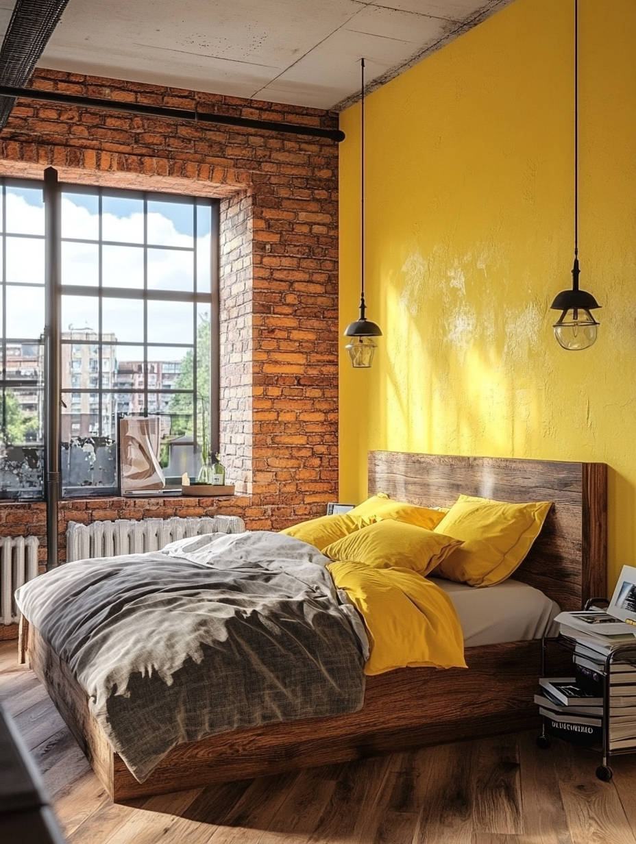 A yellow bedroom in a loft-style is a comely addition to any home and it makes the space a welcoming place. Use a combination of yellow and exposed brick or concrete to provide the bold contrast that is in, dress up the bedroom walls. Introduce the yellow theme through decor elements adding to the look and feel of the loft as a modern space in an industrial area.