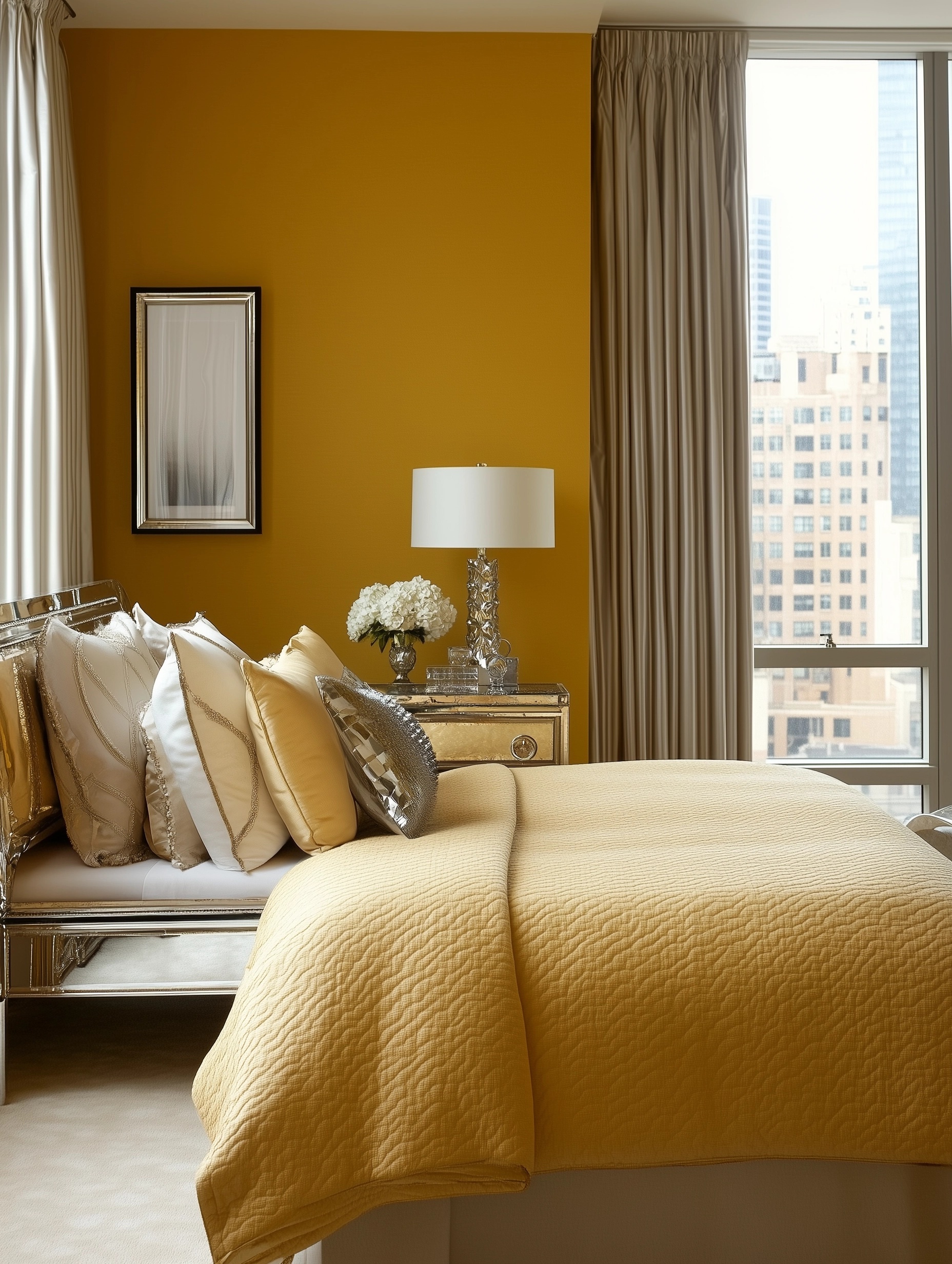 Using yellow in combination with opaque elements of silver, gold, or chrome can turn a bedroom into a luxurious and modern room. Yellow walls or complemented melding metallic furniture and decor is just the right touch of glam and sophistication. This combo is suitable for those who were the chic and contemporary look more often.