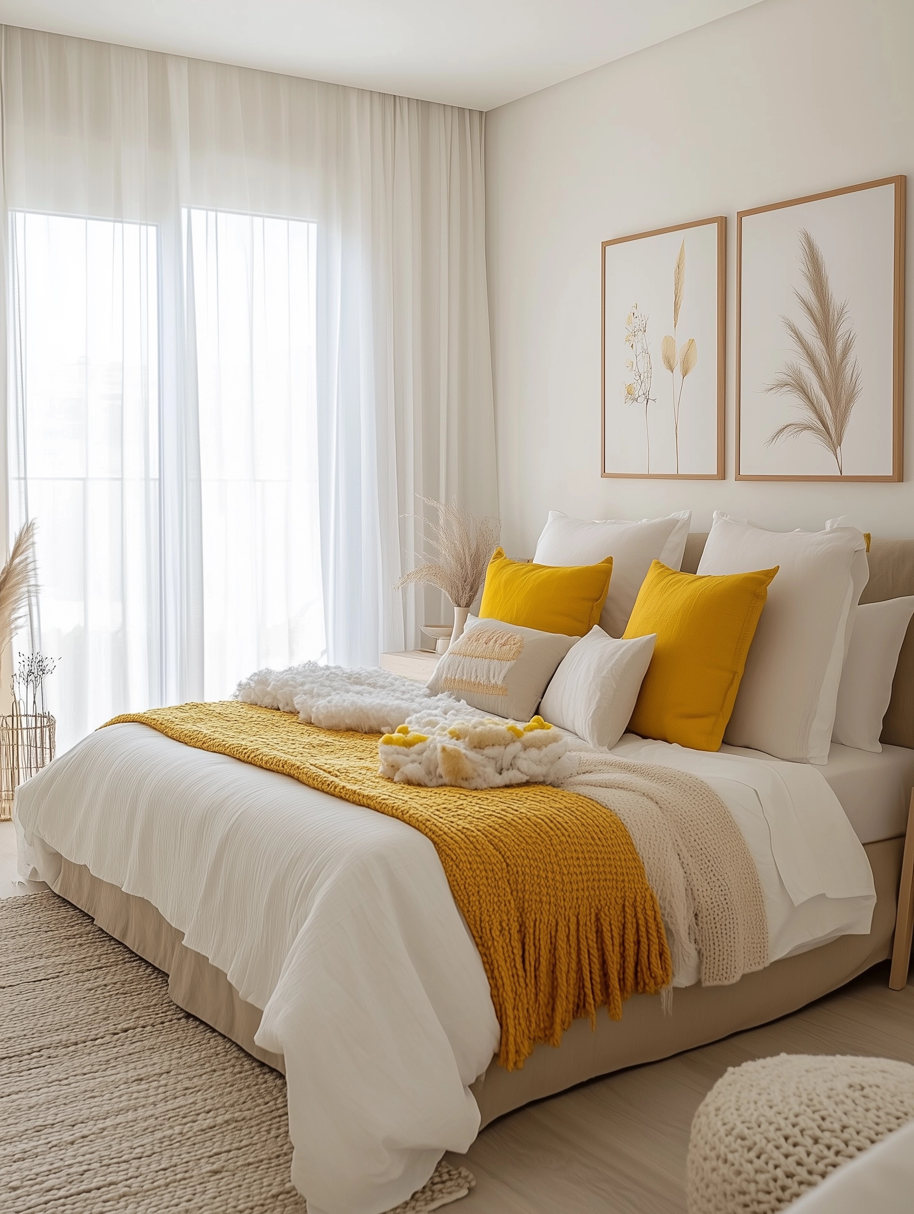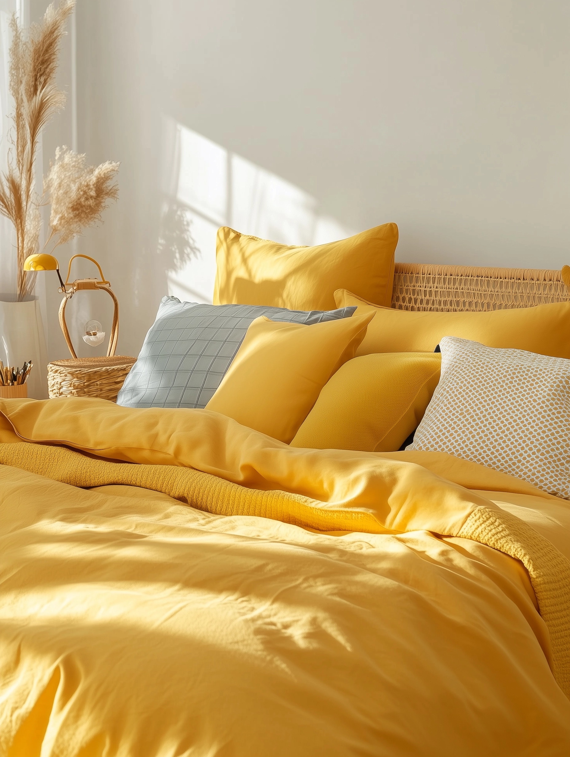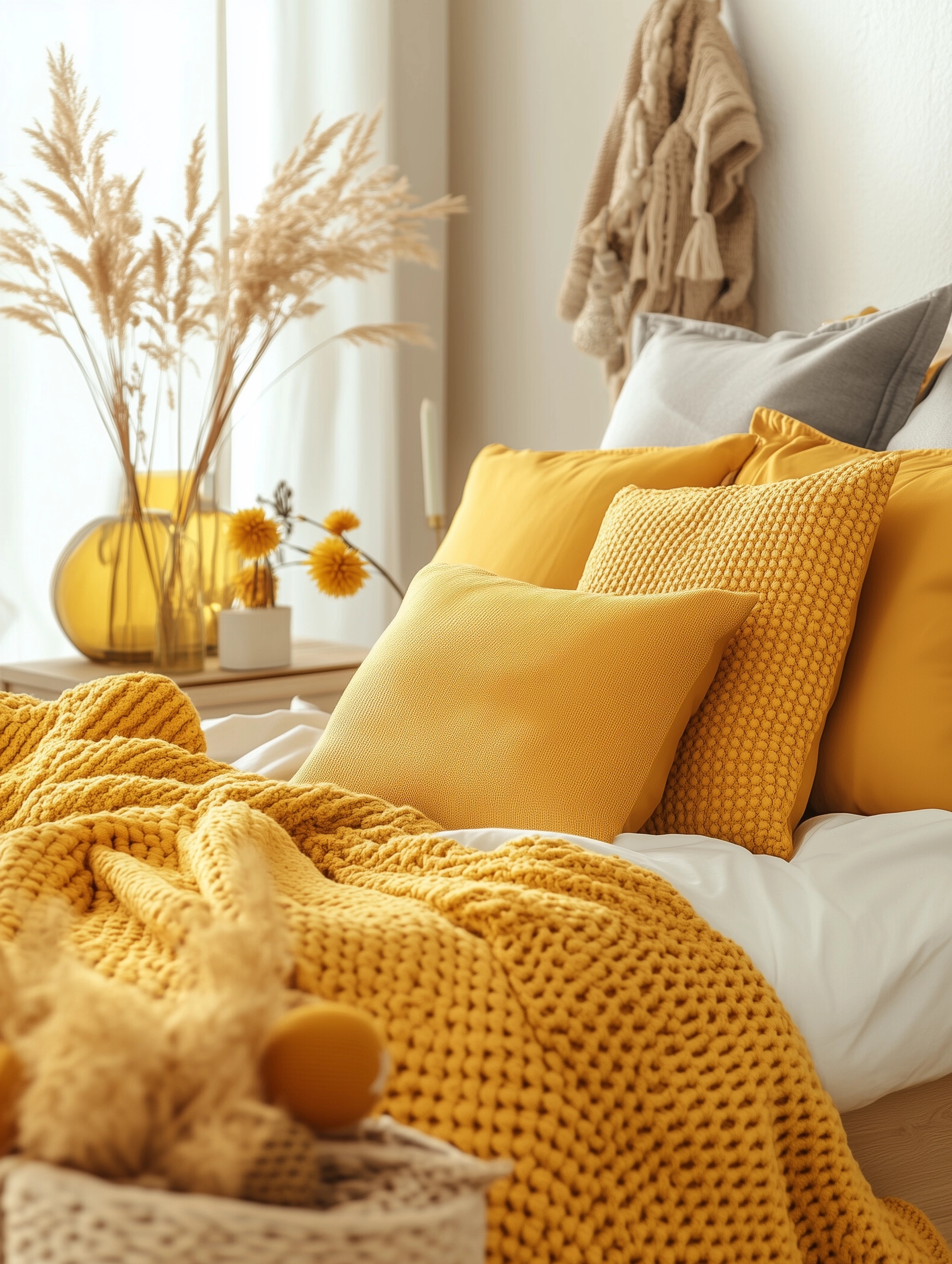 Yellow throw pillows and blankets will quickly brighten your bedroom and make it comfy. The soft and cozy materials plus the yellow weaved accents enhance the inviting feeling of the room. Being portable, these accessories can be easily replaced and are an exciting development.