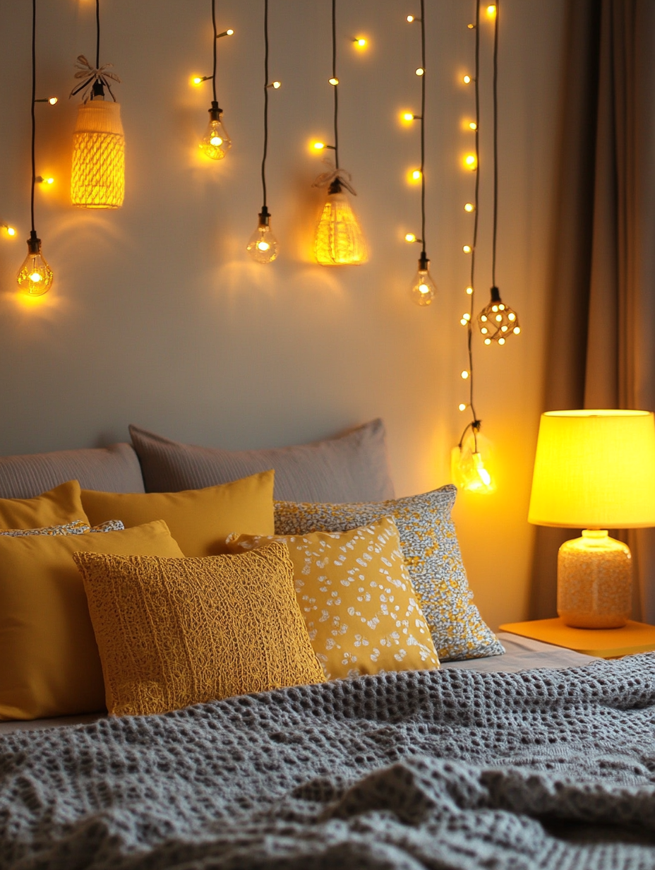 Yellow oppositions definitely add warmth to your bedroom and give the desired effect of coziness. Yellow hues can be added to your room through the use of yellow lampshades, string lights, or even LED lights that are not overly bright. These lighting options combine the perfect ambiance without screaming.