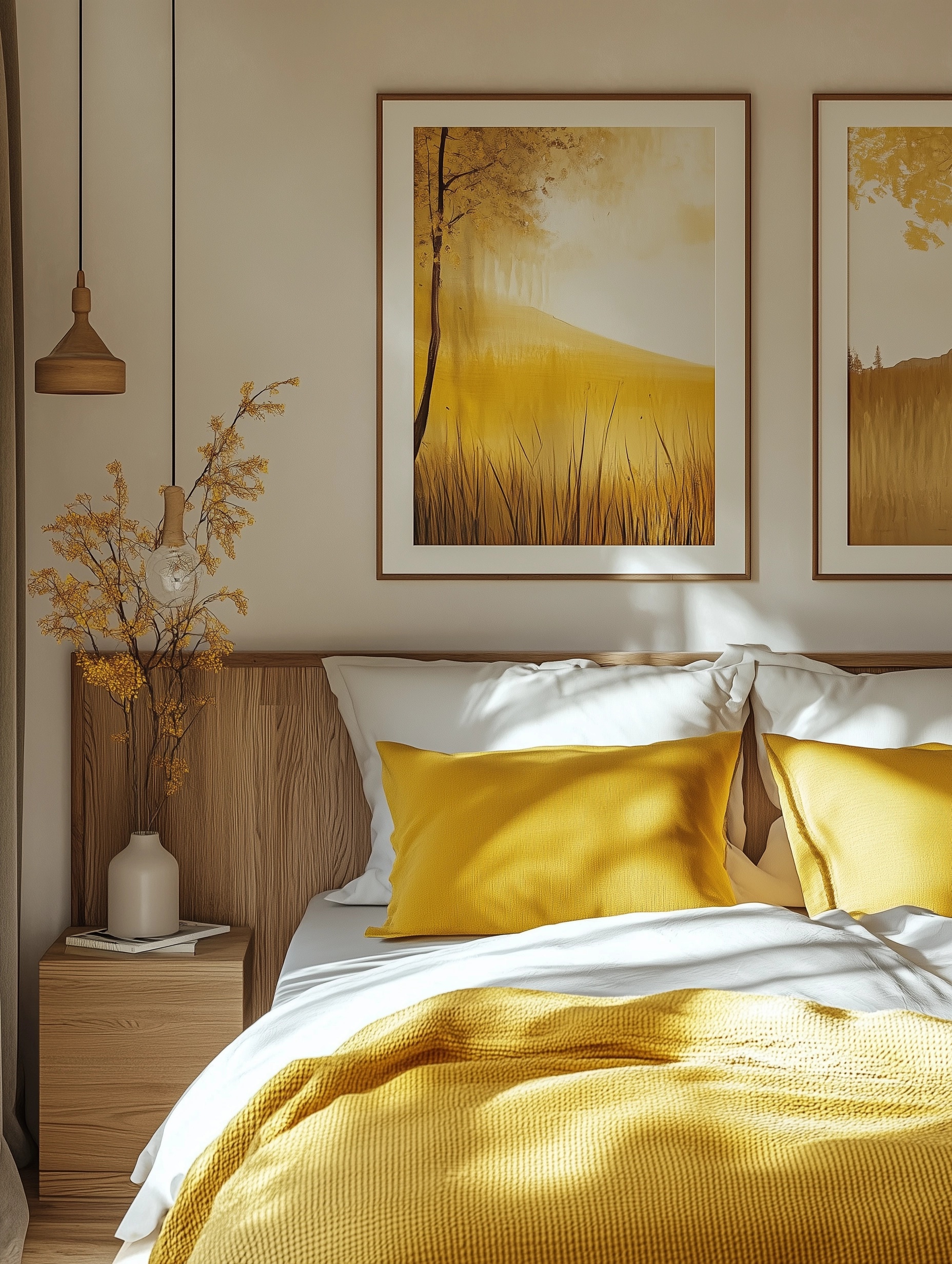 Integrate yellow artwork and prints to express your imagination and bring life to your bedroom. Find and buy colorful yet not overwhimsical pieces that are similar to your taste, whether it’s paintings of landscapes or abstract works. These paintings may function as focal points and include a touch of color on the walls.